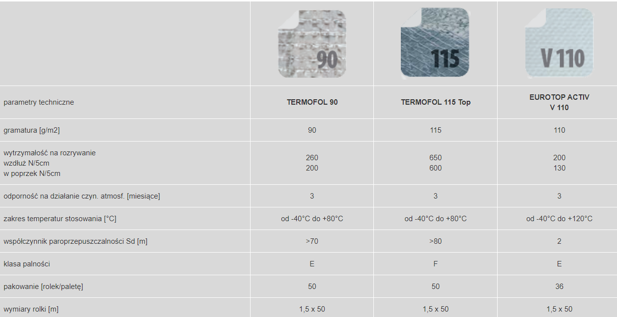 Folia paroizolacyjna zastosowana w połączeniu z membranami wysokoparoprzepuszczalnymi EUROTOP umożliwia zachowanie odpowiednich warunków klimatycznych w mieszkalnych pomieszczeniach poddasza. W ofercie występują dwa rodzaje foli paroizoalcyjnych: Termofol 90, 115 i Eurotop Activ V110. Termofol 90, 115 to folia paroizolacyjna z warstwa refleksyjną która bardzo dobrze zabezpiecza przed przenikaniem pary wodnej do termoizolacji, a dzięki obecności cienkiej warstwy folii aluminiowej odbija część ciepła pochodzącego z poddasza. Eurotop Activ V110 to aktywna folia paroizolacyjna umożliwiająca przepływ pary wodnej do wewnątrz i na zewnątrz pomieszczenia w kontrolowanych zakresach, co powoduje lepsze osuszanie dachu. Folia Eurotop Activ V110 może być stosowana również jako wiatroizolacja w ścianach wentylowanych, montowana po zewnętrznej stronie przegrody.