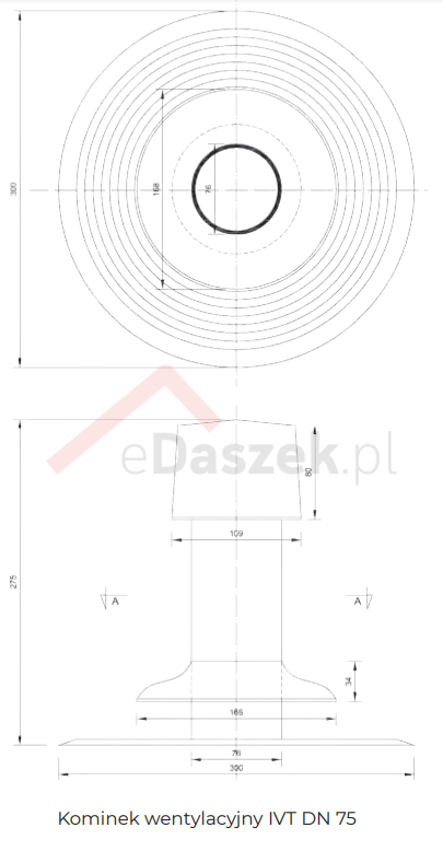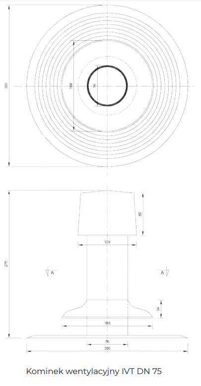 Wymiary kominka wentylacyjnego do dachów płaskich fi 75mm