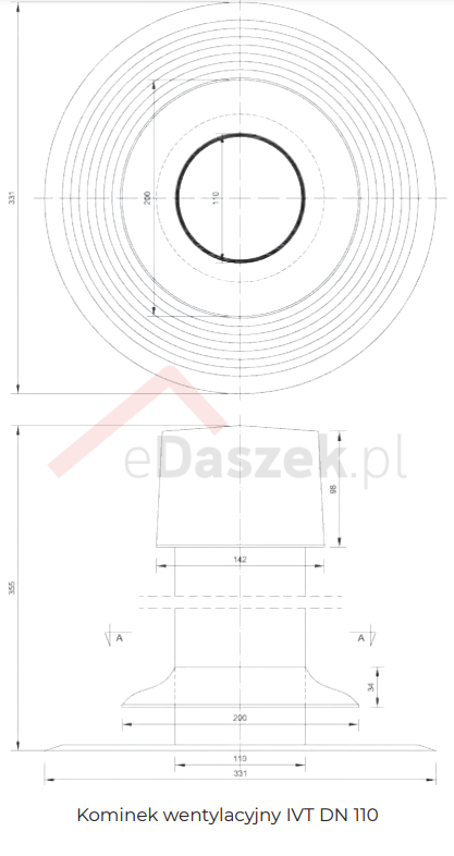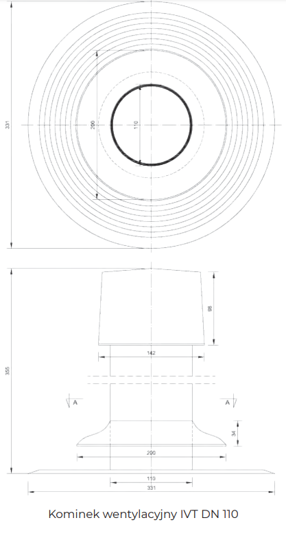 Wymiary kominka wentylacyjnego do dachów płaskich fi 110mm