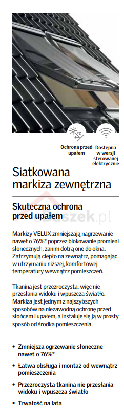 Zewnętrzne markizy VELUX (MHL, MML, MSL) zatrzymują promienie słoneczne jeszcze zanim dotrą one do szyby okiennej, dzięki czemu redukują pasywne nagrzewanie się wnętrza. Pozwala to zachować w pomieszczeniu komfortową temperaturę nawet w ciepły, słoneczny dzień. Markizy są przezroczyste, więc nie ograniczają widoczności na zewnątrz.