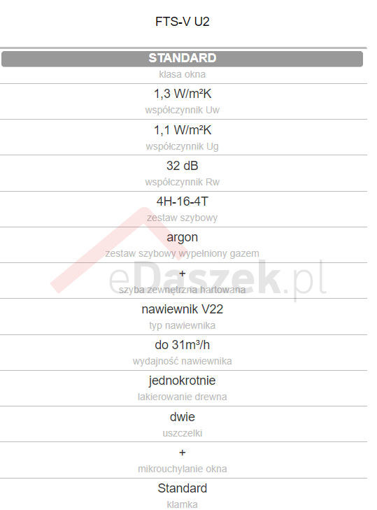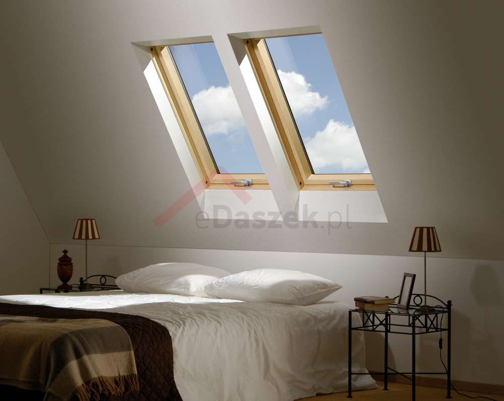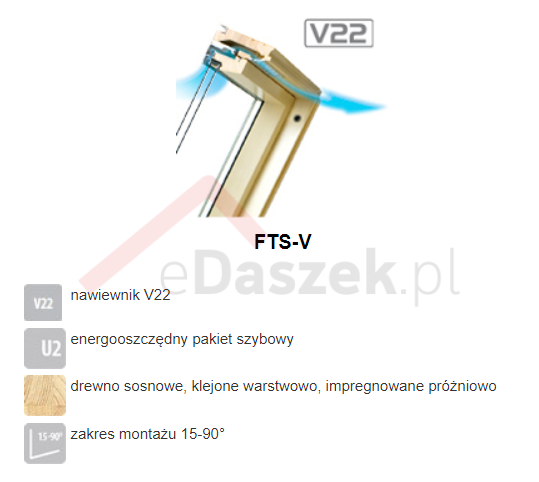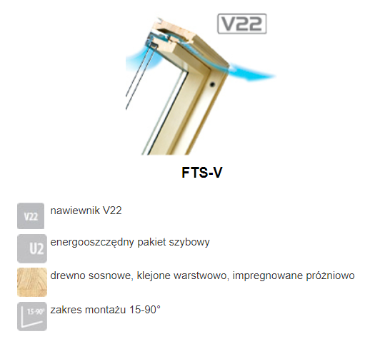 Okno otwierane w połowie osi obrotu Drewniane FTS-V U2 zastosowano nawiewnik V22, zapewniający napływ powietrza nawet przy szczelnie zamkniętym oknie. Jednokomorowy pakiet szybowy. Zewnętrzna szyba hartowana z wieczystą gwarancją odporności na grad. Wzbogacone szeroką gamą akcesoriów wyposażenia dodatkowego. Montowane w dachu o kącie nachylenia od 15° do 90°.