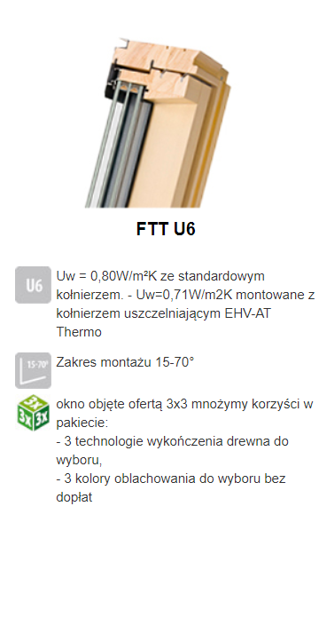 - Specjalne okna dachowe przeznaczone do budownictwa energooszczędnego oraz pasywnego. Pakiet szybowy osadzony jest w specjalnie zaprojektowanej ramie skrzydła. Posiada ona poszerzone drewniane profile w porównaniu ze standardowym oknem. W oknie zastosowano pięć uszczelek. Taka konstrukcja minimalizuje zjawisko powstawania mostków cieplnych oraz zapewnia lepszą izolacyjność okna.