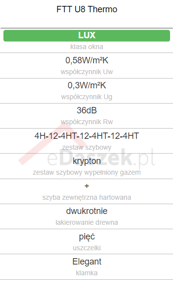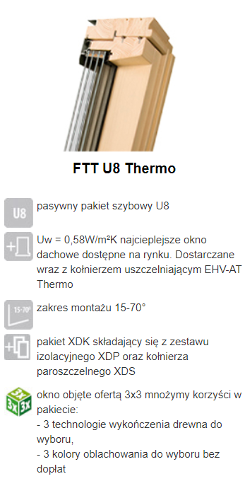 - Specjalne okna dachowe przeznaczone do budownictwa energooszczędnego oraz pasywnego. Pakiet szybowy osadzony jest w specjalnie zaprojektowanej ramie skrzydła. Posiada ona poszerzone drewniane profile w porównaniu ze standardowym oknem. W oknie zastosowano pięć uszczelek. Taka konstrukcja minimalizuje zjawisko powstawania mostków cieplnych oraz zapewnia lepszą izolacyjność okna.