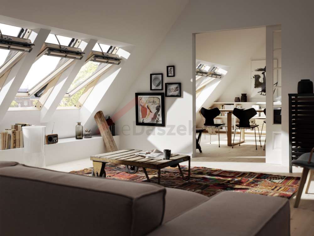 Okno VELUX otwierane w połowie osi obrotu Drewniane GGL klamka na górze 3068 z pakietem 3-szybowym
