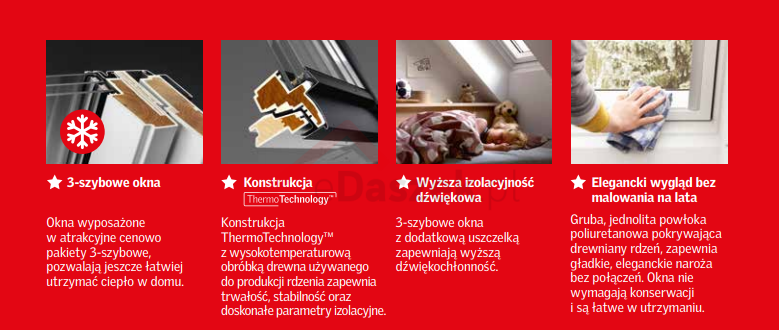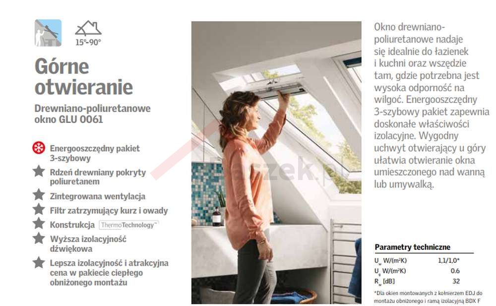 Okno dachowe GLU o drewniano-poliuretanowej konstrukcji nie wymaga żadnej konserwacji. Idealnie nadaje się do pomieszczeń o wysokiej wilgotności takich jak łazienka czy kuchnia, a konstrukcja ThermoTechnology™ zapewnia jego trwałość, stabilność oraz doskonałe parametry.