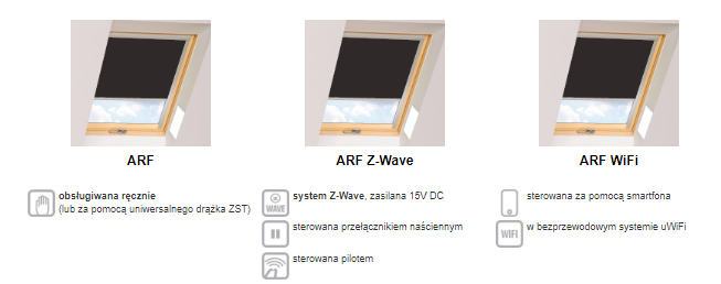 W standardowej wersji działanie rolety ARF Z-Wave możliwe jest tylko przy zamkniętym oknie. Roleta współpracuje z produktami elektrycznymi FAKRO wyposażonymi w system Z-Wave jak np. okno FTP-V Electro Z-Wave czy roleta AMZ Z-Wave.