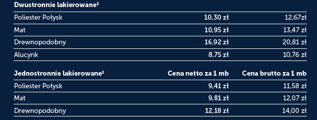Podana cena tyczy się 1mb (cena jest zmienna w zależności od rodzaj lakierowania i koloru).