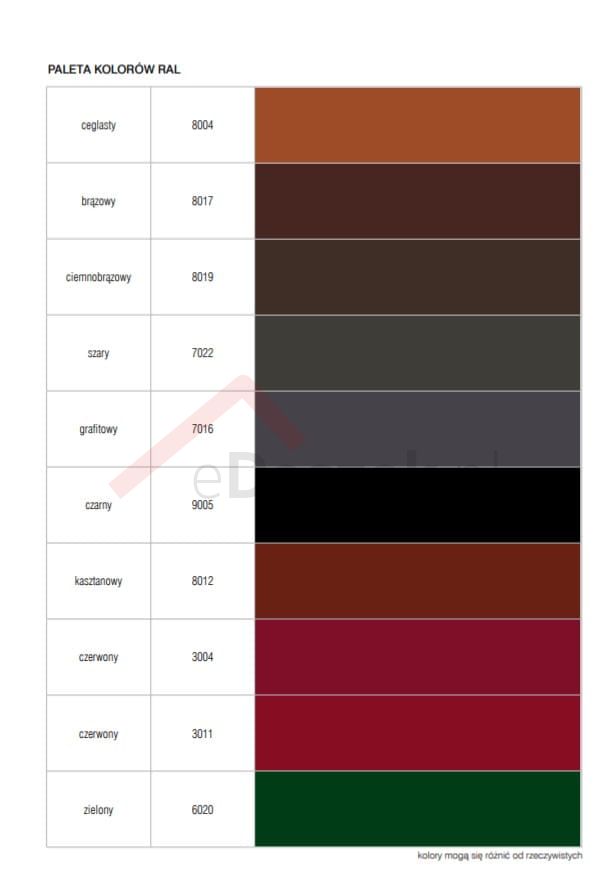 Ocynkowany ogniowo płaskownik stalowy; oferowany w wersji naturalnej (nielakierowanej) lub malowanej proszkowo. Istnieje możliwość dostarczenia wsporników polakierowanych na nietypowy (inny niż wymieniony w tabeli) kolor za dodatkową dopłatą (termin realizacji do 10 dni).